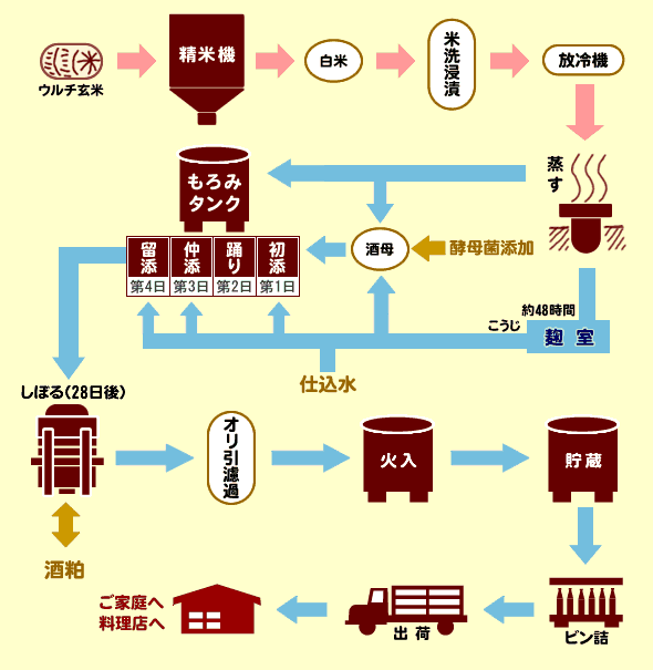 日本清酒的制作工艺十分考究。精选的大米要经过磨皮,使大米精白,浸渍时吸收水分快,而且容易蒸熟;发酵时又分成前、后发酵两个阶段;杀菌处理在装瓶前、后各进行一次,以确保酒的保质期。